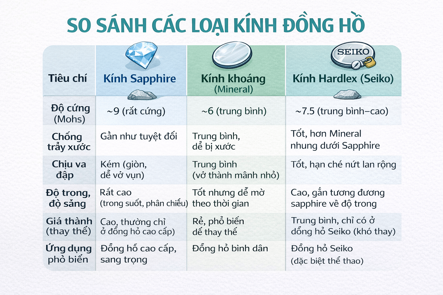 Dưới đây là bảng tổng hợp so sánh các đặc tính chính của kính Sapphire, Mineral và Hardlex: