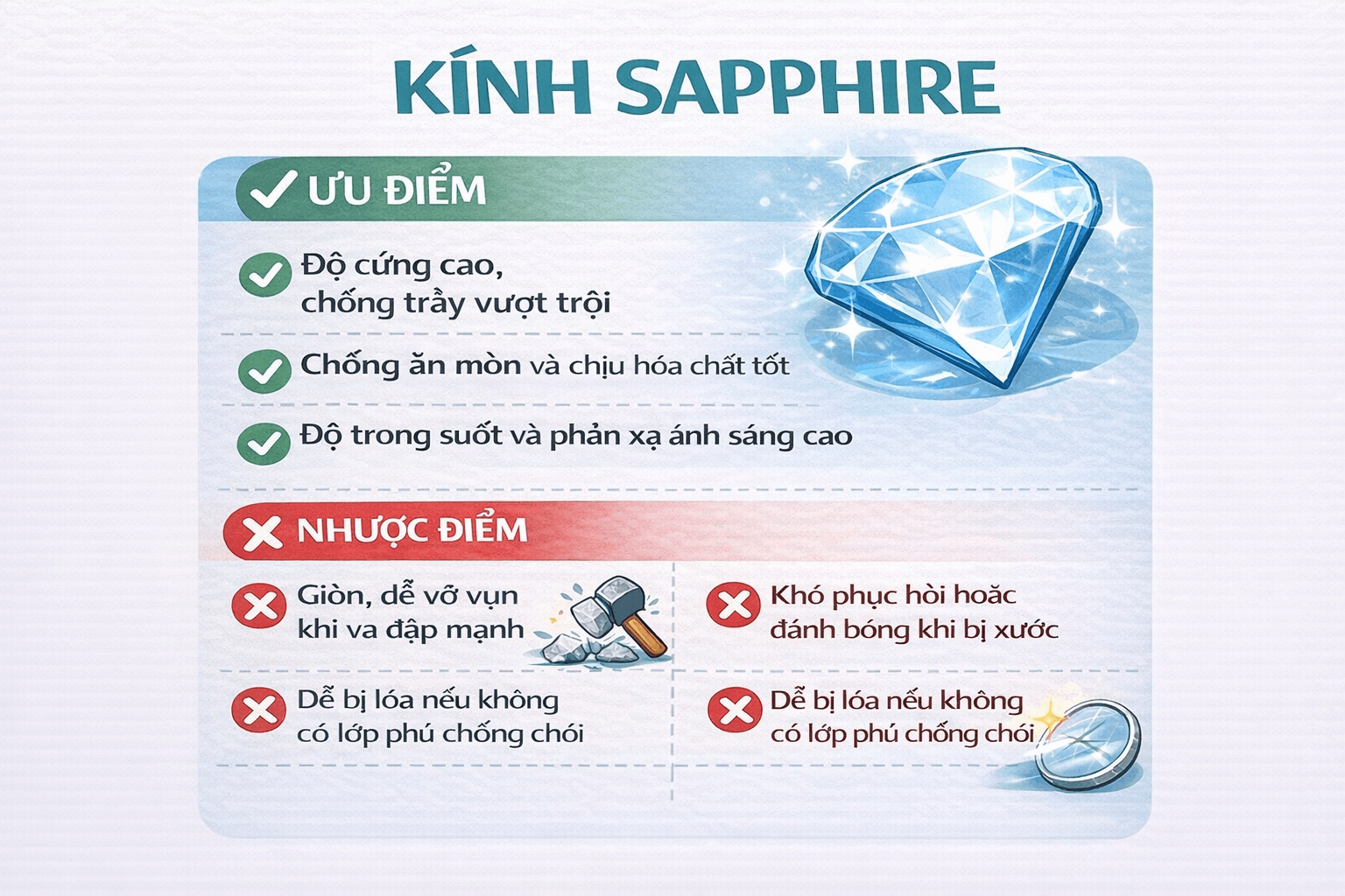 • Giòn, dễ vỡ vụn dưới va đập mạnh: Mặc dù rất cứng, sapphire lại giòn về mặt cơ học. Khi chịu va đập tập trung, dễ vỡ vụn thành nhiều mảnh nhỏ sắc nhọn. Điều này có nghĩa là chịu lực mạnh có thể làm nứt hoặc vỡ kính thay vì chỉ lõm bề mặt.